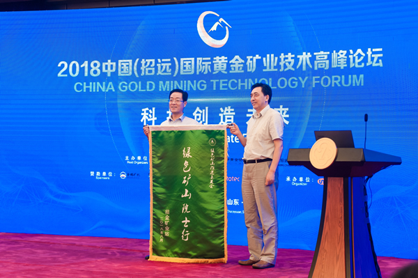 中國(guó)工程院院士、綠色礦山推進(jìn)委員會(huì)名譽(yù)會(huì)長(zhǎng)武強(qiáng)為招金礦業(yè)股份有限公司執(zhí)行總裁董鑫頒發(fā)綠色礦山院士行旗幟。