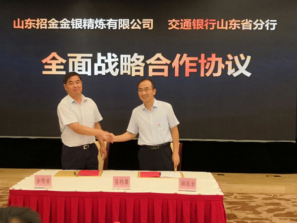 山東招金集團(tuán)副總經(jīng)理、招金精煉/招金銀樓董事長(zhǎng)欒文敬與交通銀行煙臺(tái)分行黨委書(shū)記祝傳芳簽約