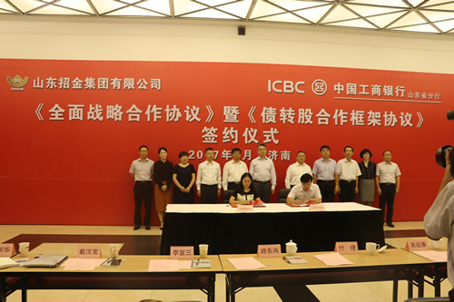 9月19日,山東招金集團(tuán)與中國工商銀行山東分行在山東濟(jì)南簽訂了《全面戰(zhàn)略合作協(xié)議》暨《債轉(zhuǎn)股合作框架協(xié)議》。招金集團(tuán)董事長路東尚,副總經(jīng)理李宜三、招金礦業(yè)財(cái)務(wù)總監(jiān)戴漢寶、招金財(cái)務(wù)公司總經(jīng)理曲麗華;工行山東省分行行長付捷、副行長吳迎春、工銀金融資產(chǎn)投資公司投資一部總經(jīng)理陳國立以及山東分行金融業(yè)務(wù)部、信貸與投資管理部、授信審批部、煙臺(tái)分行等相關(guān)人員出席簽約儀式。